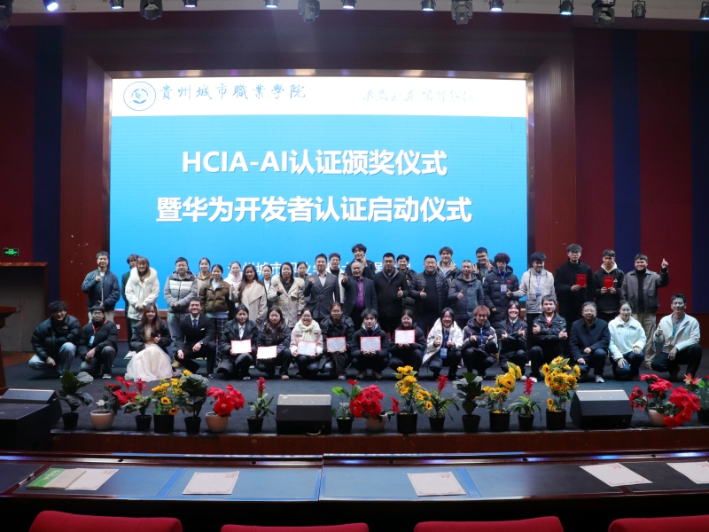 为深入贯彻落实党中央、国务院关于发展人工智能的决策部署,深化产教融合、校企合作,切实提升高素质技术技能人才的培养质量,贵州城市职业学院大数据学院于12月16日在学校四楼才艺展示厅举行“以证赋能,智启未来”HCIA-AI认证颁奖仪式暨华为开发者认证启动仪式。华为技术有限公司贵州产业发展部教育总监孙文翔、北京博海迪信息科技股份有限公司贵州分公司(泰克教育)徐涛副院长、梁春晓老师及大数据学院全体师生参加活动。